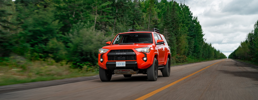Under the hood, the Toyota 4Runner TRD PRO distinguishes itself from the competition with its old-school yet reliable single powertrain: a 4.0L V6 engine combined with a 5-speed automatic transmission. This combination develops a decent 270 hp and a respectable 5,000 lbs towing capacity. The 4Runner feels slow on the road due to its weight and lack of a turbo. You can expect a 0-100 kph time in the high seven, which was expected. While the transmission is sluggish in changing gears, the loud exhaust note brings a hint of vintage to the ensemble. Steering is vague, and there's a lot of body roll when you take a hard turn. When you brake, the whole weight shifts from the back to the front, and it can get old quickly.